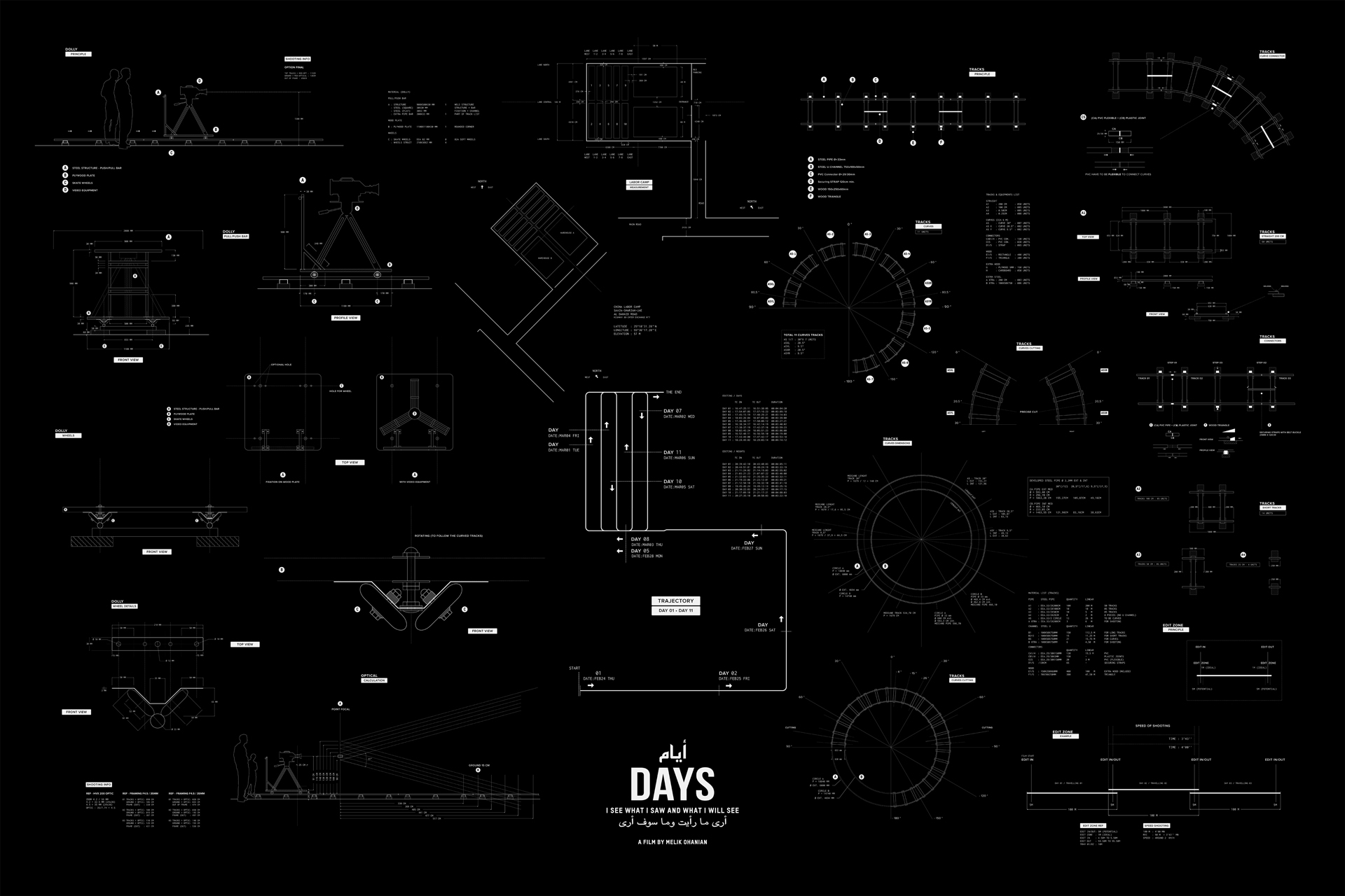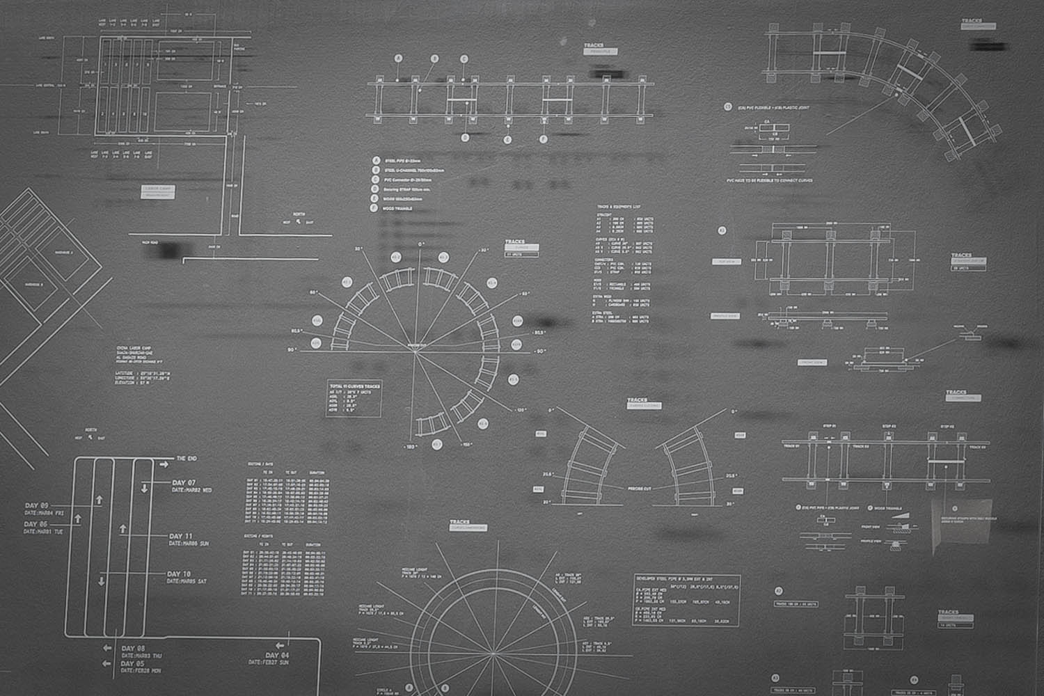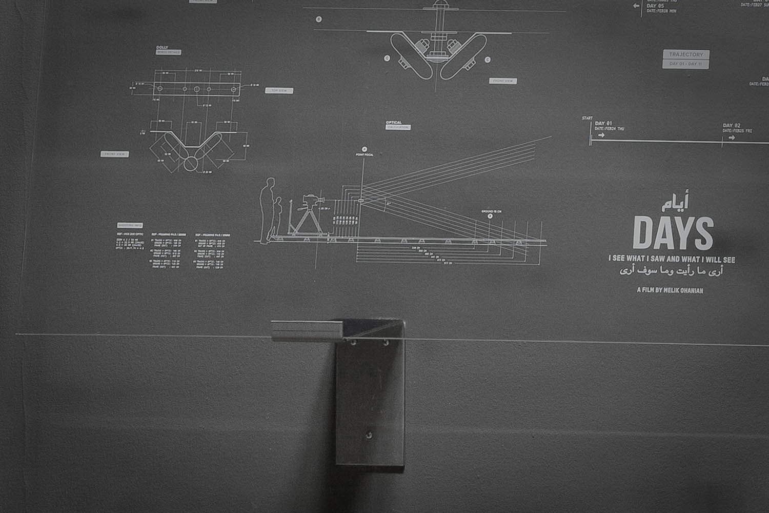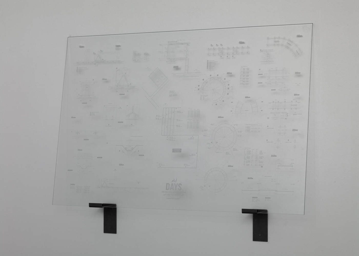 Sur une plaque de verre de 120 x 180cm sont sérigraphiés l'ensemble des dessins techniques de Melik Ohanian pour la réalisations du film DAYS, I See What I Saw And What I Will See. Considérée par l'artiste comme la partition ou le blueprint de l'oeuvre, nous découvrons les dessins préparatoires pour la construction des rails du travelling, les études pour la prise de vue et pour la production des outils, ainsi que le dessin de la trajectoire complète accompagnée des observations métriques et temporelles du lieu de tournage.