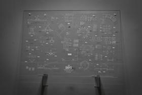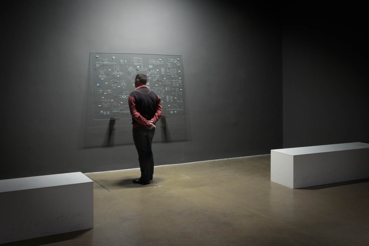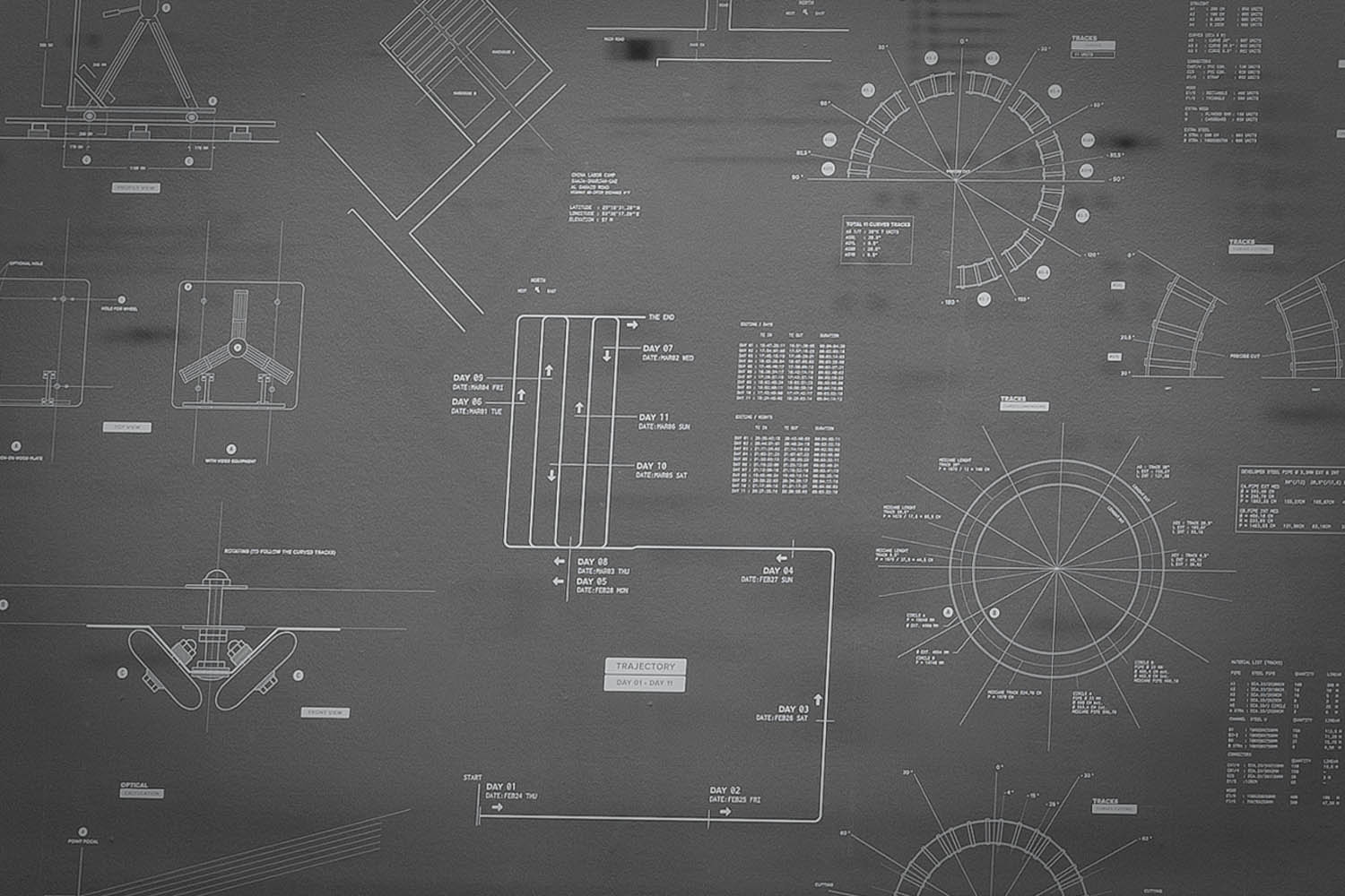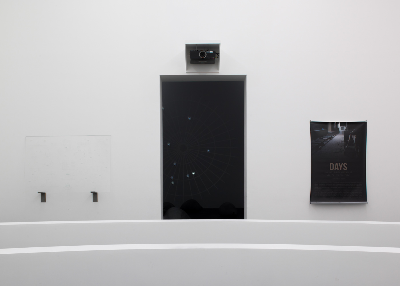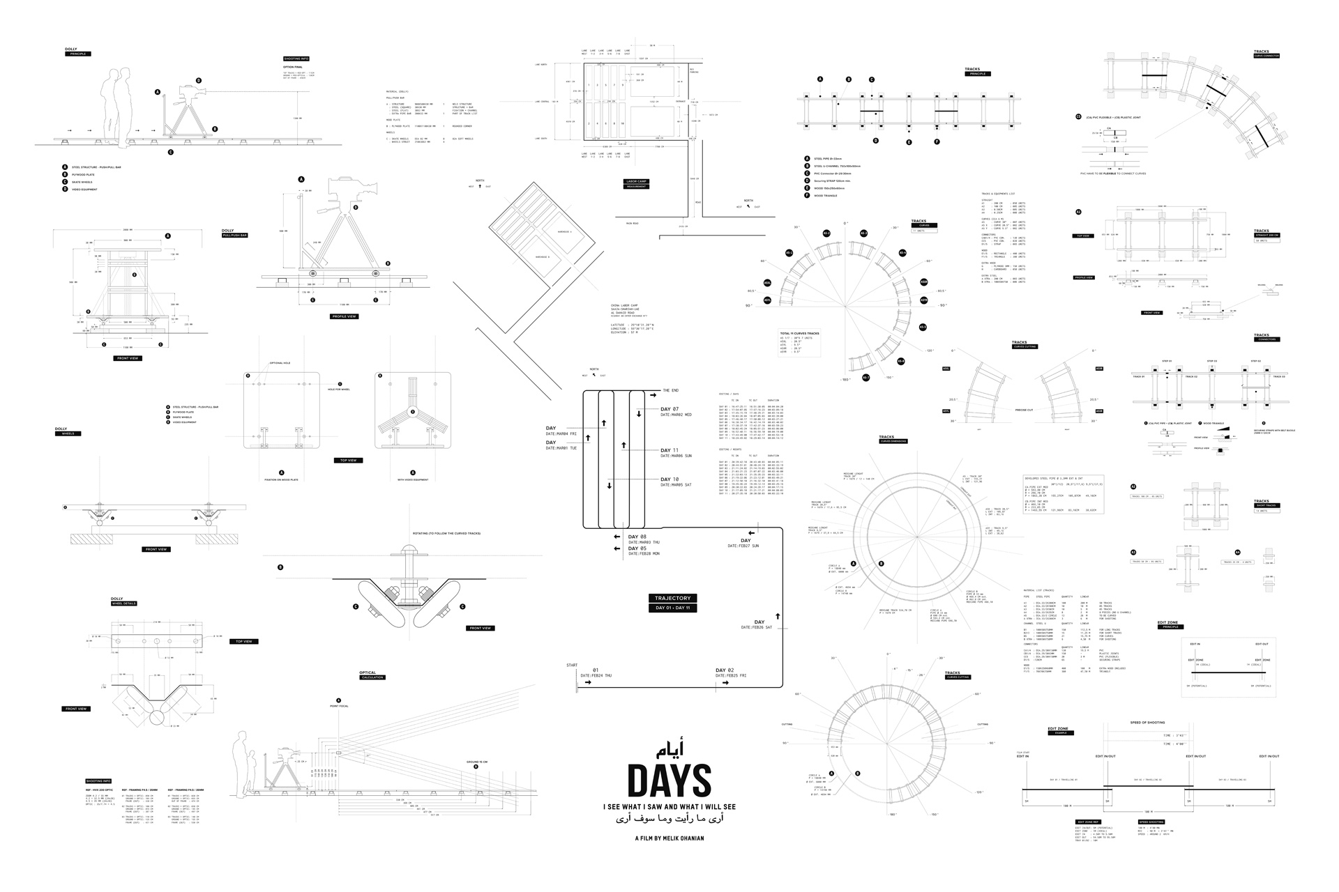 Sur une plaque de verre de 120 x 180cm sont sérigraphiés l'ensemble des dessins techniques de Melik Ohanian pour la réalisations du film DAYS, I See What I Saw And What I Will See. Considérée par l'artiste comme la partition ou le blueprint de l'oeuvre, nous découvrons les dessins préparatoires pour la construction des rails du travelling, les études pour la prise de vue et pour la production des outils, ainsi que le dessin de la trajectoire complète accompagnée des observations métriques et temporelles du lieu de tournage.