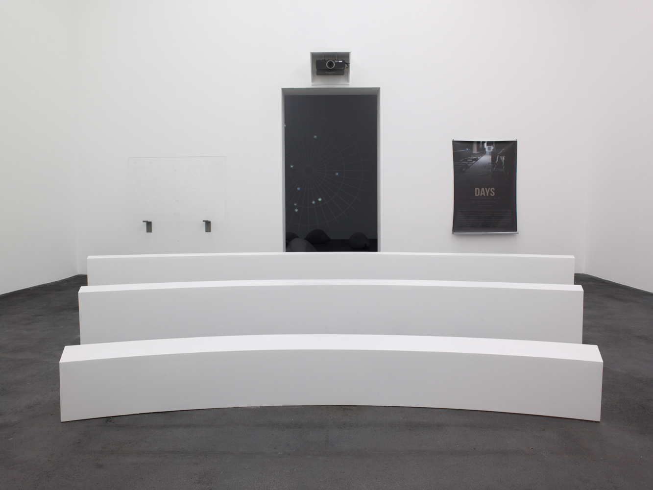 DAYS, I See what I Saw and what I will See explores the notion of producing a continuous representation of space and a discontinuous representation of time – at the same time. The film was shot over 11 days from 24th of February to 6th of March 2011 in the China Labour Camp in Sajaa, Sharjah. Melik Ohanian built 100 meters of tracks to make travelling shots. He installed the tracks during the day, and then filmed 100 meters in approximately 4 minutes. The following day, he dismantled the tracks, re-assembles and moves 100 meters ahead, and films again. This scheme is repeated for 11 consecutive days shooting both during the day and at night. The incremental editing of the daily recordings produced two singular 'plan sequences' representing 1100 meters of space and 41 minutes of time. The two versions – a day version and a night version – are projected at the same time, on the two sides of the screen built specifically for the exhibition space.