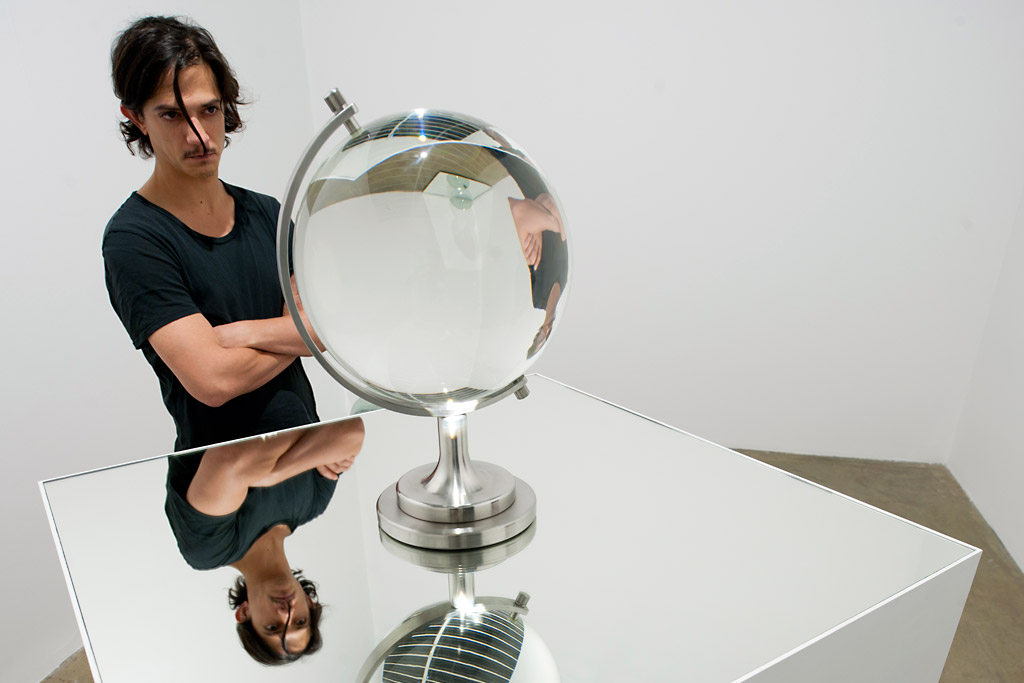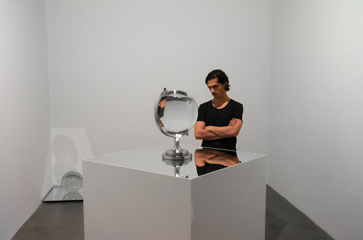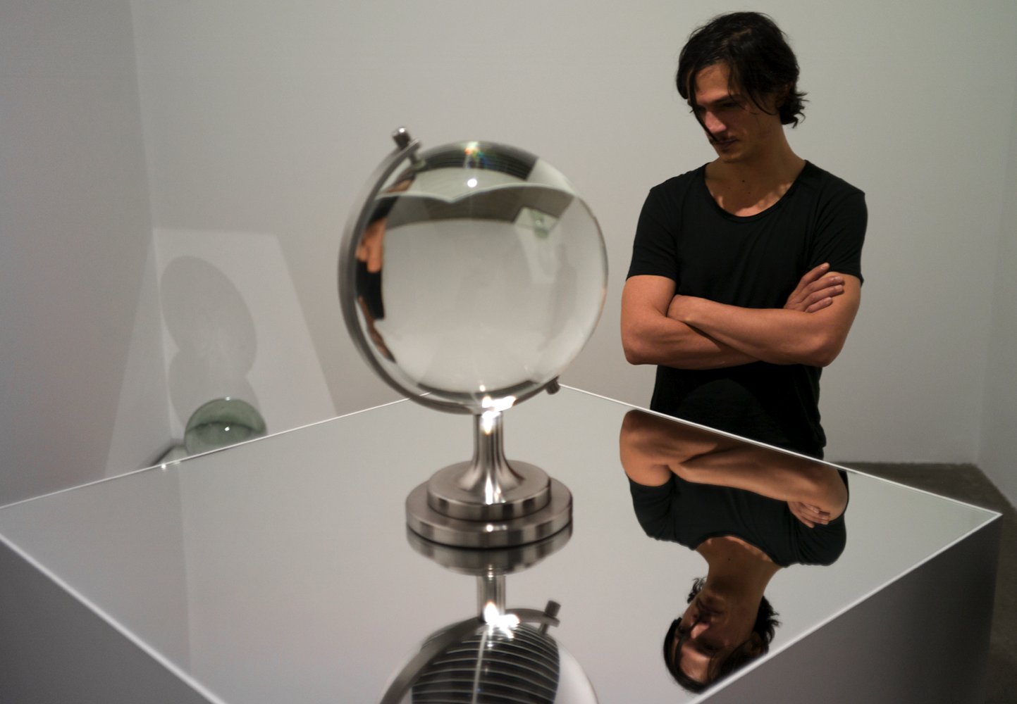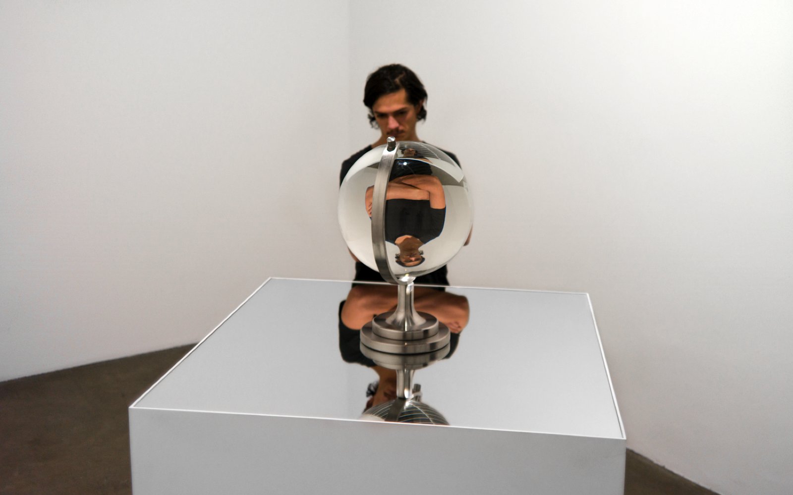 Cette sculpture est née de l’idée d’inversion des pôles. Ce phénomène géologique, fréquent à l’échelle de l’histoire de la Terre, résulte d’une perturbation du noyau qui entraîne une migration des pôles magnétiques à la surface du globe. À l’issue de ce processus, les pôles retrouvent leur position initiale, ou permutent. Aujourd’hui, la diminution de l’intensité du champ magnétique laisse présager une possible inversion des pôles d’ici quelques milliers d’années. Futuring se plaît à donner une interprétation visuelle de ce phénomène aux conséquences encore incertaines. Le miroir forme un axe où se projette une image inversée du monde : le pôle « sud » du globe y devient le « nord », et le « nord » y devient le « sud ». La sphère de verre, elle, offre un jeu complexe d’inversion du haut et du bas, de la gauche et de la droite des éléments qui s’y reflètent et s’y déforment.