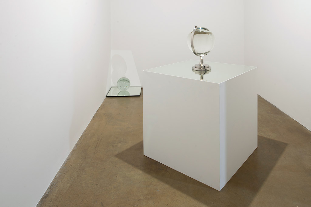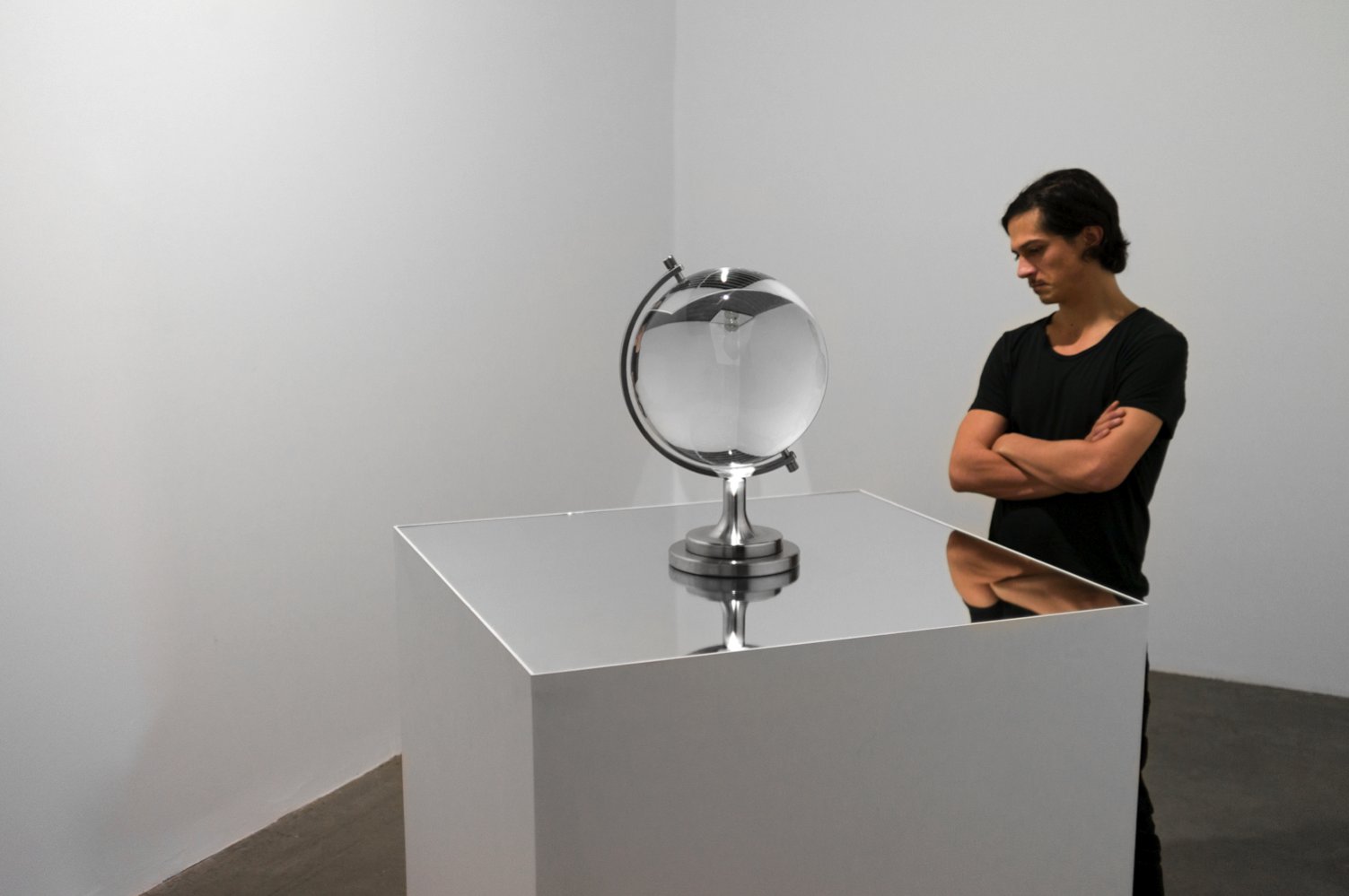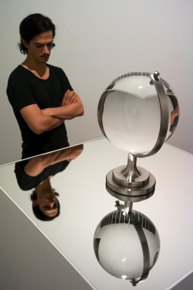 Un globe de verre de 33cm, monté sur un pied en métal. Fixé en deux points sur un axe incliné, il rappelle les globes terrestres utilisés depuis la fin du XVème siècle par les géographes. Présenté au centre d’un socle cubique surmonté d’un miroir, celui-ci existe en deux versions : Planet, dont le verre fabriqué industriellement est homogène ; et Cosmos, dont le verre fabriqué artisanalement est criblé de bulles d’air. L’artiste voit dans la première l’image de notre planète, tandis que se lit dans la seconde un univers, un macrocosme dans un microcosme.