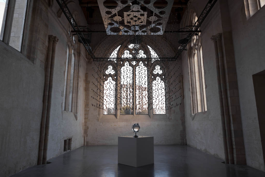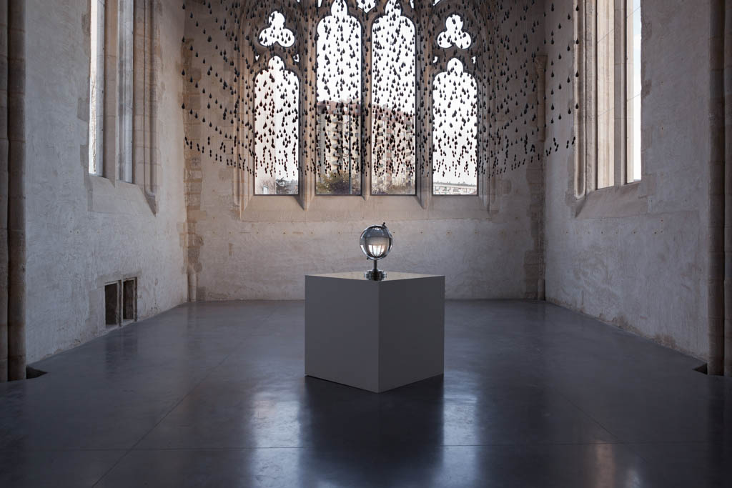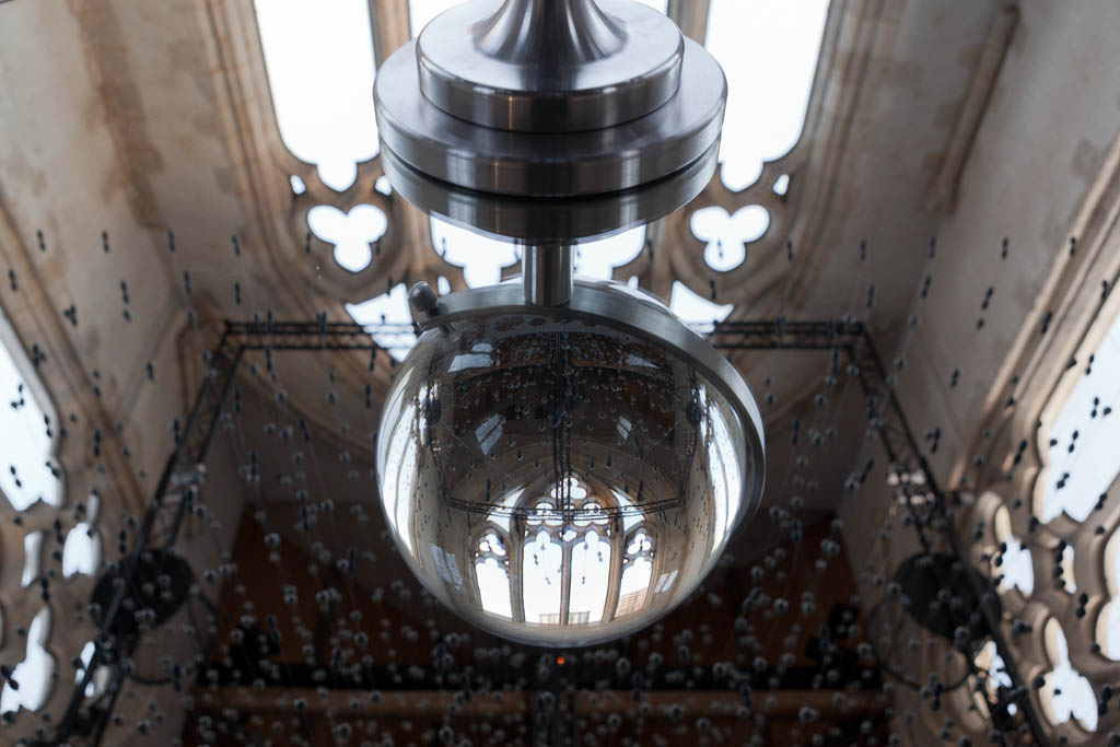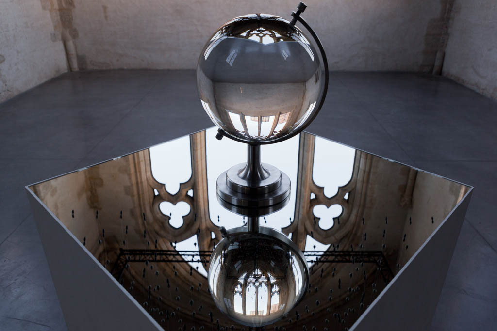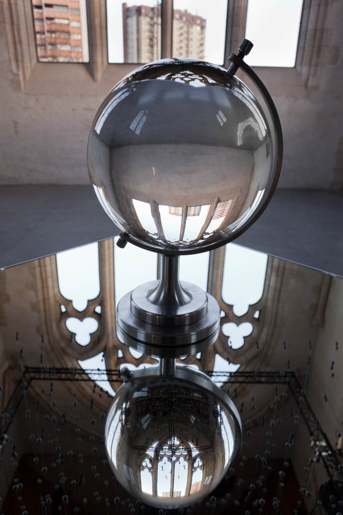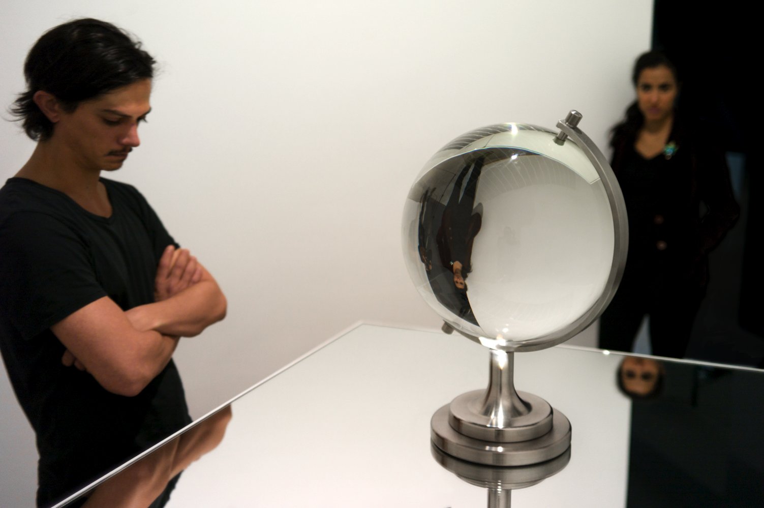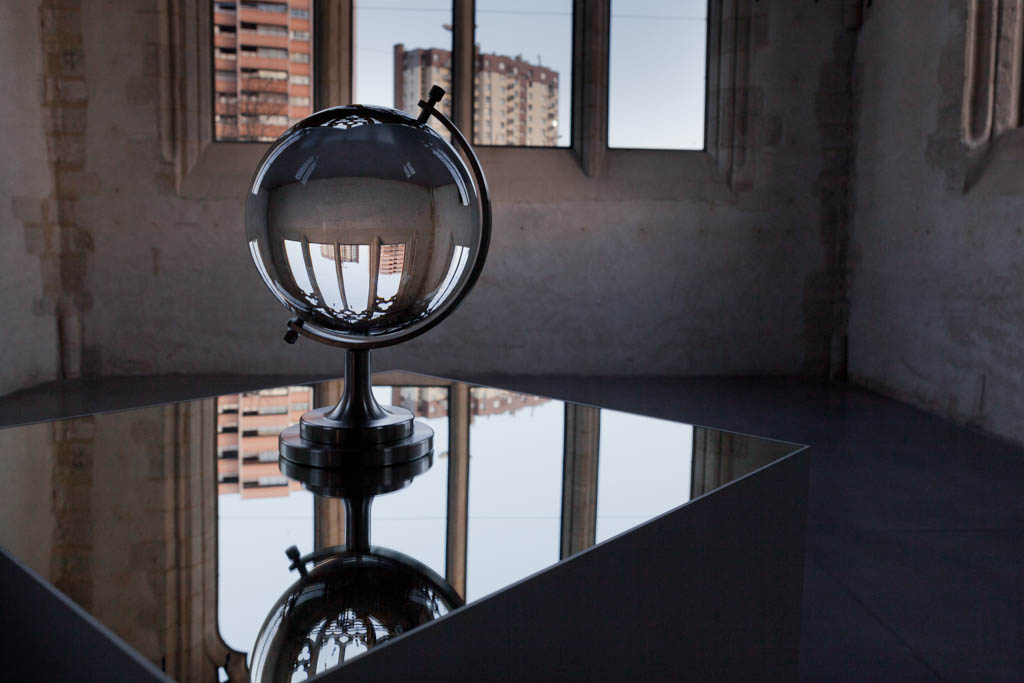 Objet d’attraction et de fascination, l’œuvre incite au jeu, au déplacement. Elle se pratique, et fait du visiteur un expérimentateur qui gravite autour. La sphère, en absorbant puis renvoyant une image inversée de nous-mêmes et du lieu, met en corrélation différents points de l’espace. Elle fait de son contexte un monde, qui évolue sans cesse au gré des points de vue. À la manière d’une loupe, elle offre de la réalité une vision hypertrophiée et fragmentaire, où la partie devient le tout. Cette sphère, finalement, produit des univers. Elle fonctionne comme un globe oculaire - qui s’empare d’un champ du réel, en inverse l’image, puis le livre à l’interprétation, ou à l’imaginaire. Articulant une lentille, un miroir, et la lumière, cet objet est aussi de nature photographique. Il est dans tous les cas un capteur, un espace de projection et d’invention où se faire son cinéma.