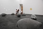Shell (2014) - Monnaie d’échange millénaire venue de Chine, le cauri est devenu le premier moyen de payement, par l’intermédiaire des échanges commerciaux, des anciennes civilisations d’Afrique. Mais les cauris sont également utilisés lors de rituels divinatoires. Entre valeur économique et augurale, les cauris sont ici reproduits en béton et disposés selon le lancé des curateurs de l’exposition, comme autant de possibilités de lire le monde.