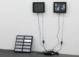 Earth Partitions (2014) is ready to be perused by onlookers. On the two screens of recessed monitors, a mime artist bearing an accelerometer re-enacts, like a partition, the shaking of the ground recorded during different earthquakes by seismographs. Before him, the seismograms that he reinterprets are in turn re-recorded by a custom-made seismograph. The performance took place and was recorded in the exhibition space at CRAC in Sète (July 2014) before the preview. The seismographs used for this unique reconstitution are presented in a light box placed on the ground.