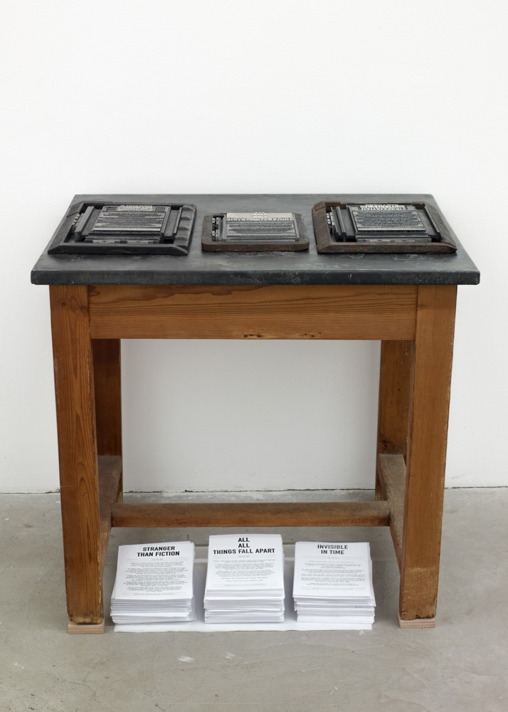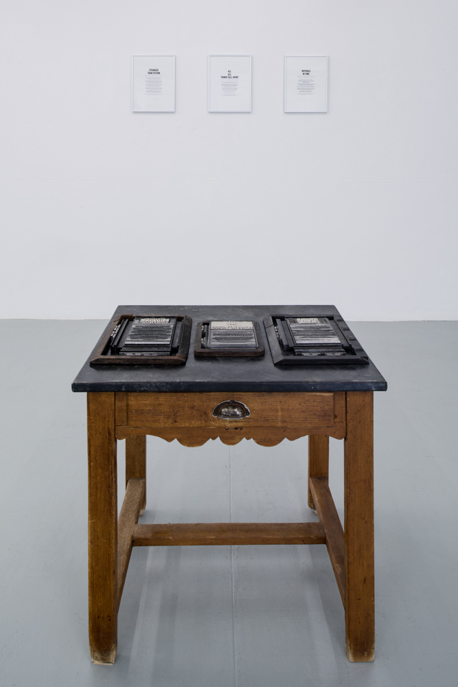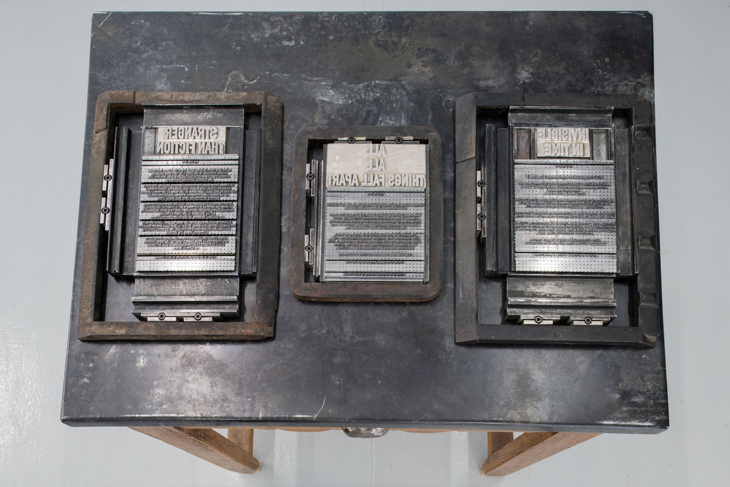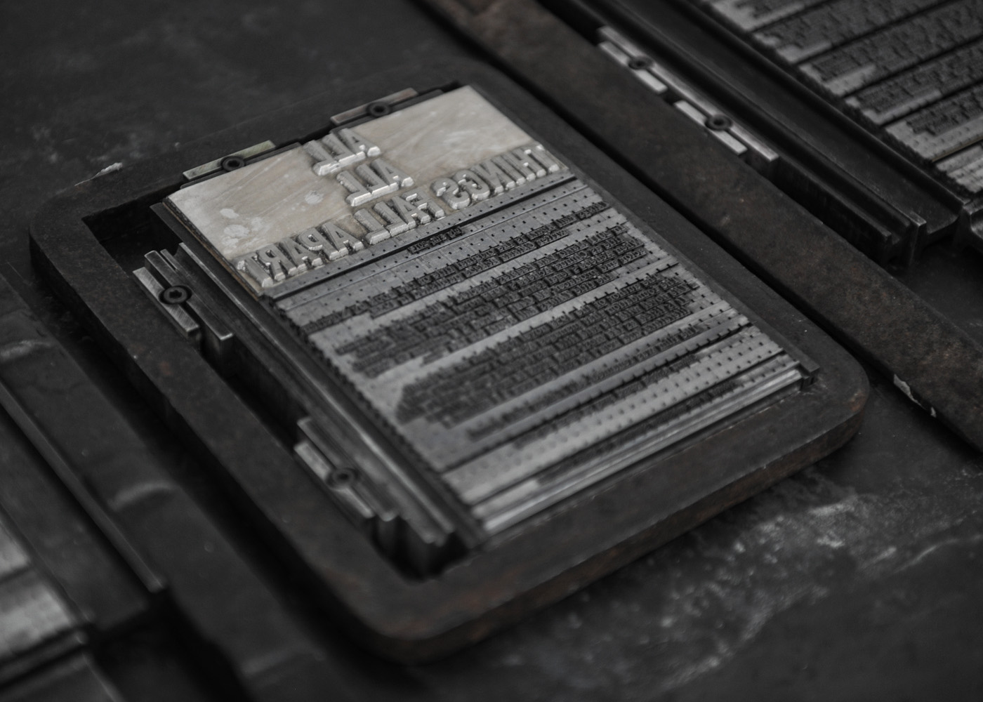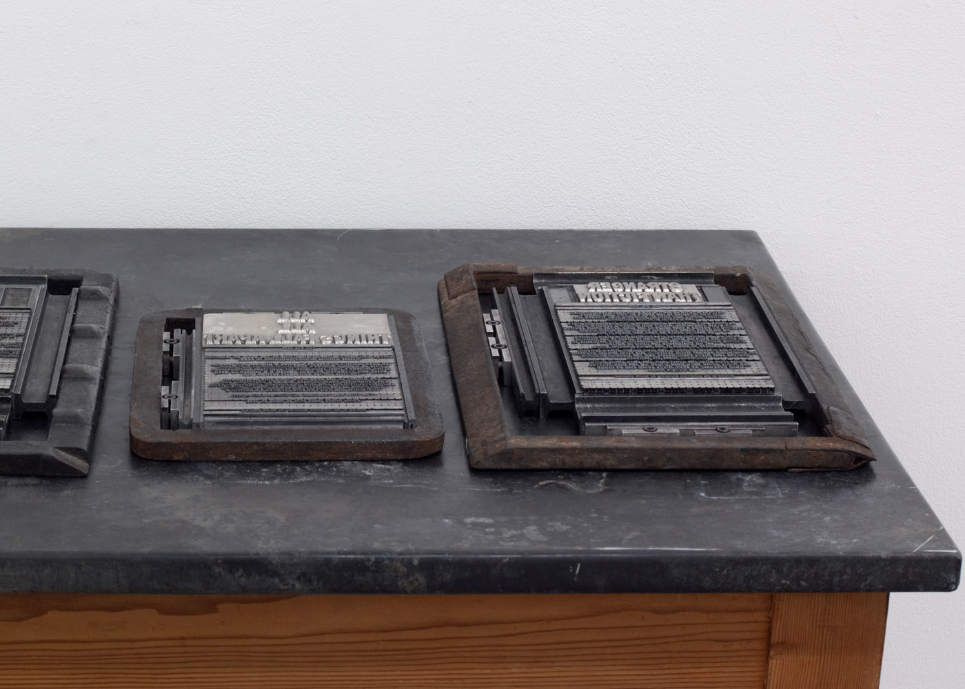 Whereas the question of the document is essential to address the Datcha Project, Producing History (2014) consists of a revival of an obsolete printing technique considered revolutionary at the start of the 20th century. The printing technique used is Linotype, a machine invented in 1885 that revolutionized publishing enabling small studios to input large texts rapidly and allowing the daily press to make huge progress around 1900 by providing a reactivity that was previously impossible.
