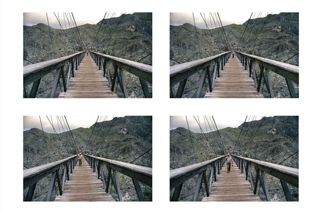 El Puente d’Ojuela, État de Durango, Mexique. Un homme, visiblement ouvrier, paraît au bout du pont venant du flanc de montagne où se trouve la mine d’Ojuela - fermée depuis longtemps. La ville, bâtie lorsqu’elle était exploitée, est à présent en ruines, et seul le pont, toujours en fonction, a survécu à sa désertion. Cette rencontre improbable, décrite par l’artiste comme un « accident de vision », survint alors que Melik Ohanian revenait de La Zona del Silencio, où il réalisait les photographies de l’installation A Territory of No Event. Première œuvre accueillant le visiteur au Plateau lors de l’exposition « From The Voice To The Hand », en 2008, ce fragment de réel initiait une réflexion sur le statut et la temporalité des images.