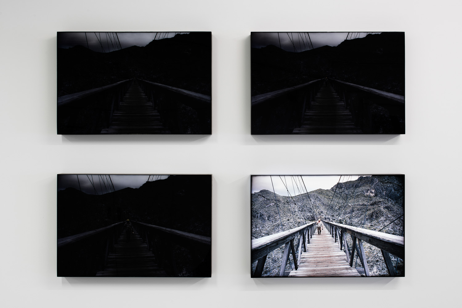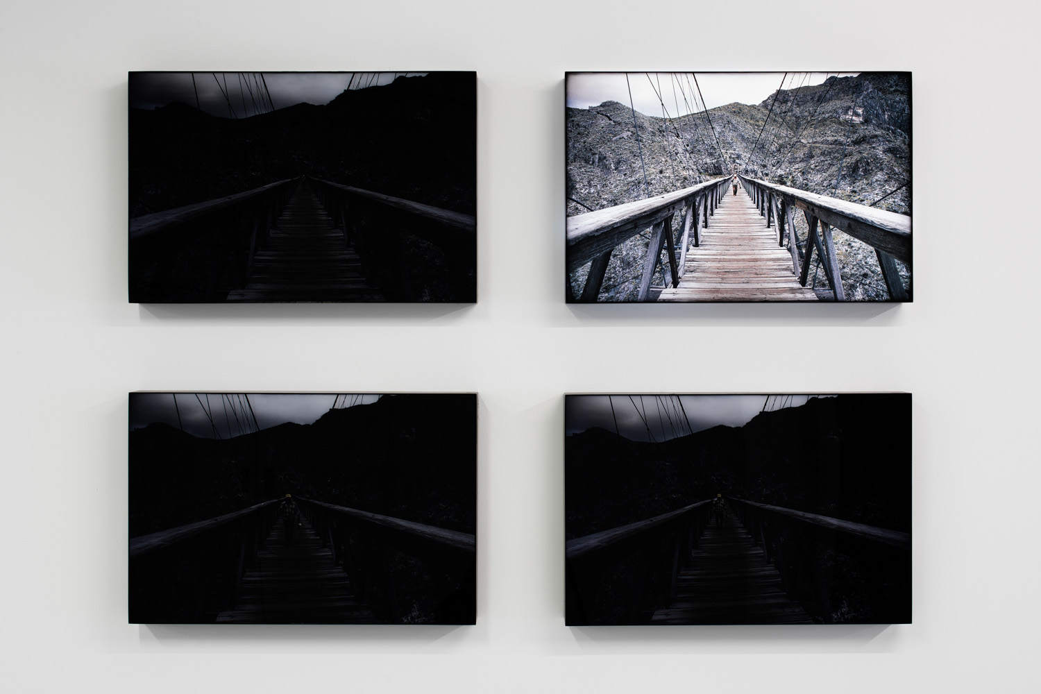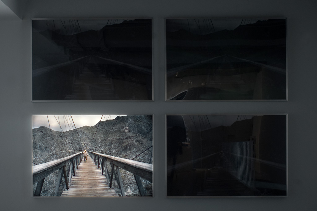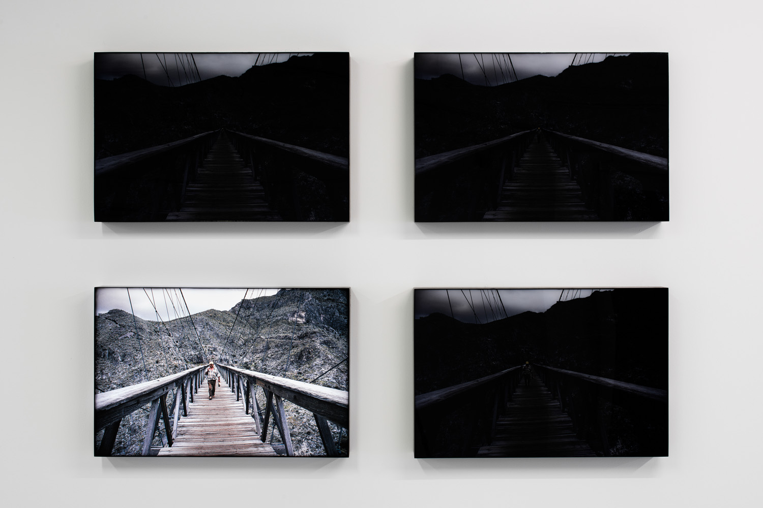 The installation Return From Memory consists of four large light boxes. The four photographs displayed in the light boxes track the image of a man moving across a wooden suspension bridge in Mexico. El Puente d'Ojuela, Mapimi, Durango. Animated light times the character’s progression through the distance of the landscape (at 8-second intervals per image). The temporality created by the repetitive presence and successive absence of images, invites visitors to question their own presence through the experience of time effects in our perception of images.
