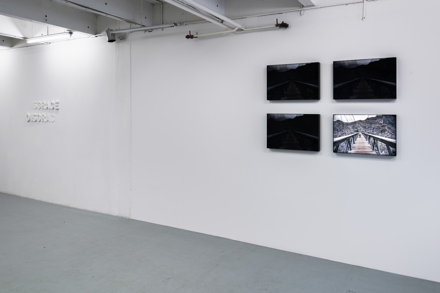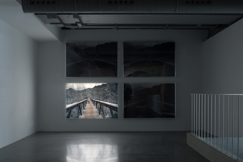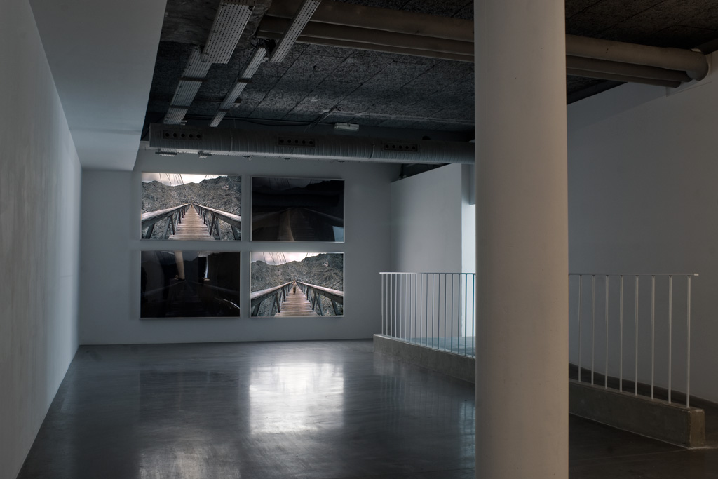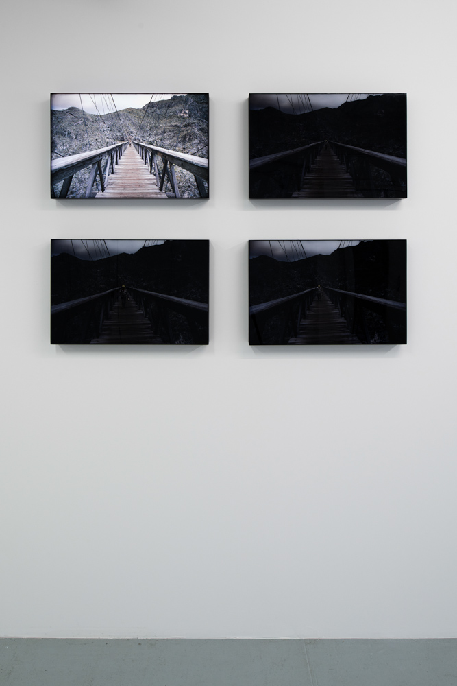 The installation Return From Memory consists of four large light boxes. The four photographs displayed in the light boxes track the image of a man moving across a wooden suspension bridge in Mexico. El Puente d'Ojuela, Mapimi, Durango. Animated light times the character’s progression through the distance of the landscape (at 8-second intervals per image). The temporality created by the repetitive presence and successive absence of images, invites visitors to question their own presence through the experience of time effects in our perception of images.