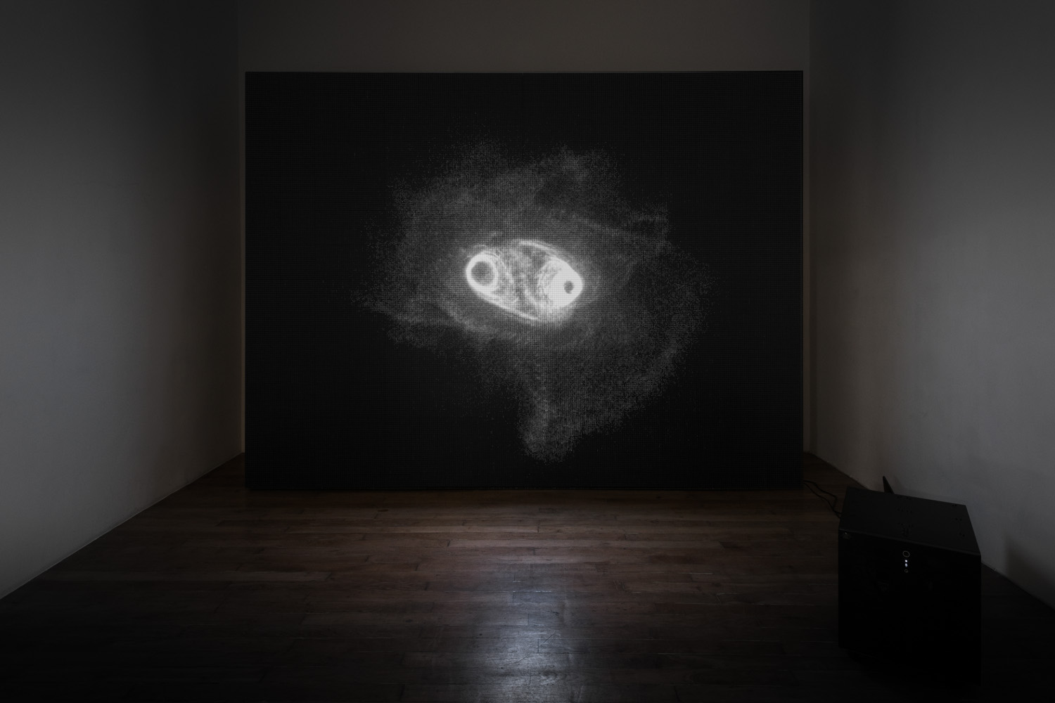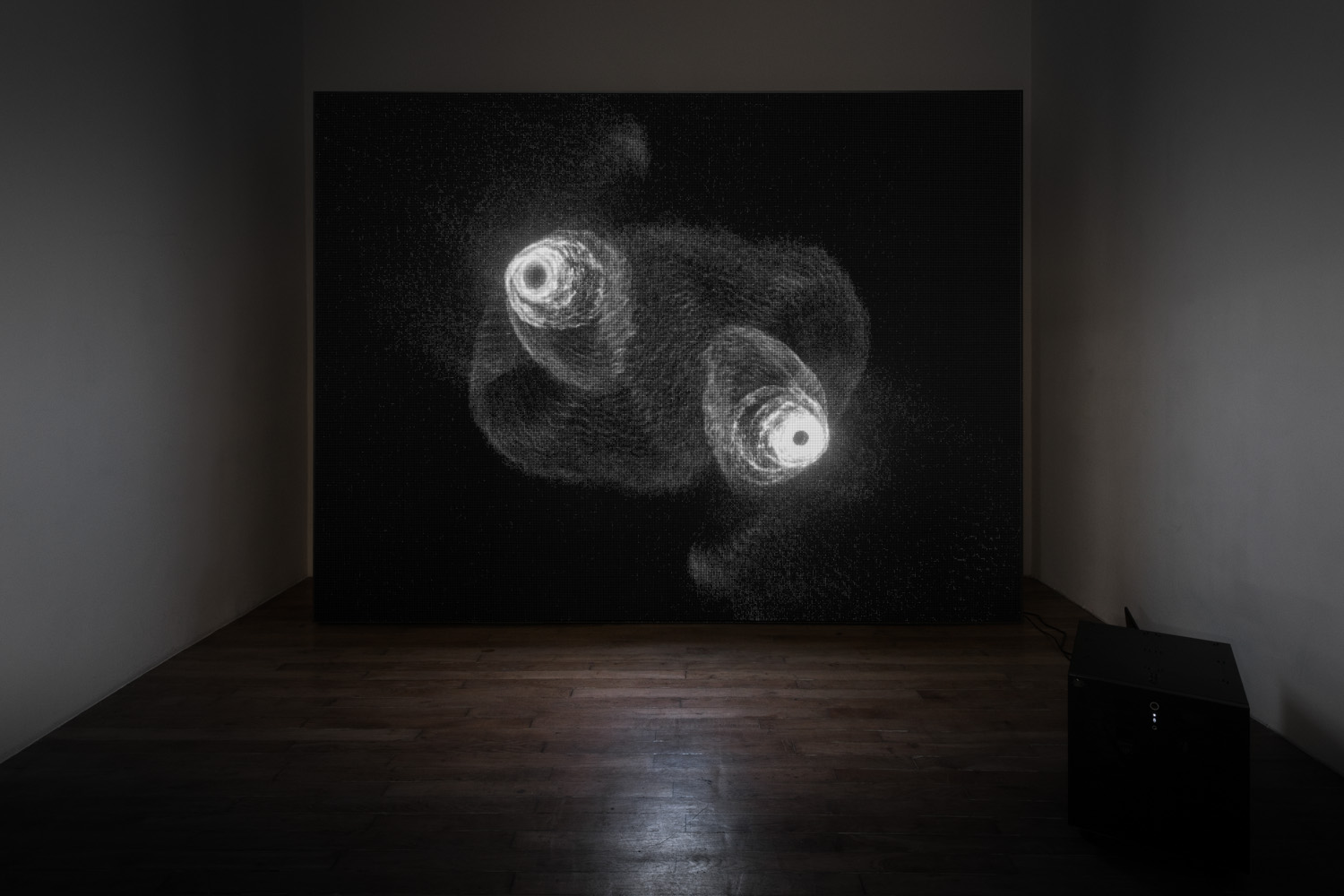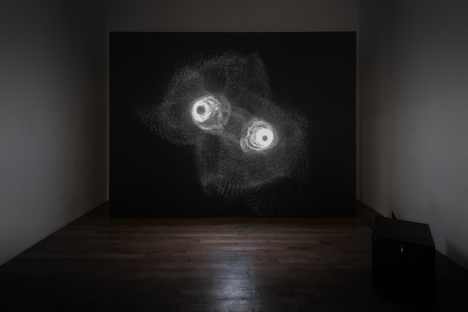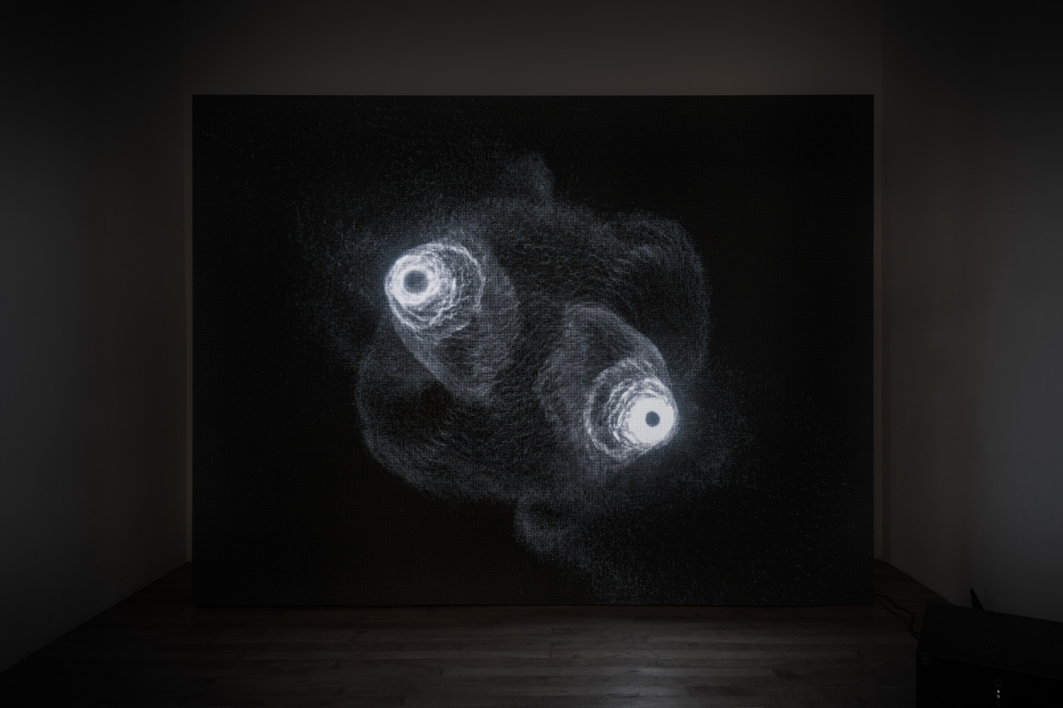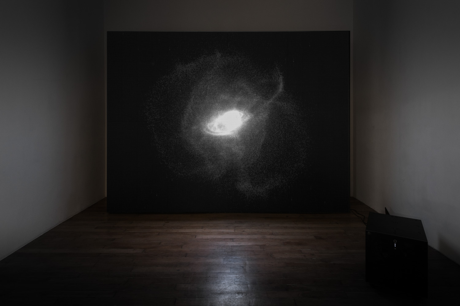 With Modelling Poetry (2012/2014) history is no longer the subject , quite the contrary, it is more about the future, an uncertain, intangible future, but which takes shape in front of our eyes. According to NASA, the Milky Way and the Andromeda Galaxy will collide in approximately 4 billion years. Taking this information as a starting point, Melik Ohanian develops an algorithm translates a number of astronomical parameters into pixels operating like celestial bodies in our Universe. Through making this final disaster visible, we are plunged in a tangible, perceptible time.