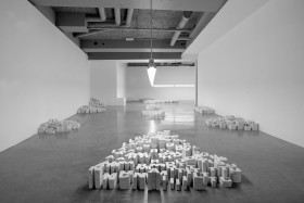 The artist dismantled phrases said by philosophers, sociologists and other figures above within his philosophical horizon, creating heaps of letters in the form of hand-made plaster casts... The white letters measured 16 cm in height and were placed in tidy piles: the ‘A’s together, the ‘B’s together, and so on. Through these, Melik Ohanian evoked a pre-linguistic stage of language. Each heap corresponded to the retranscription of the soundtrack extract of a figure’s voice, but here the letters forming this retranscription were piled up on the floor in disorder. Estrangement. Only a plaque bearing the name of the person quoted was present above the line of neon lights above the heaps, informing us of the paternity of the quotation. A few words emerged from this sea of letters, because the visitors were allowed to move the plaster letters around to re-introduce some meaning. Although the quotations were set out in Le Plateau like a series of archipelagos reduced to pure morphology, to their simple three-dimensional form, the fact remains that these were linked to another archipelago (the 15 joint exhibitions) and to the website, which in some way restored a territory to the whole in a movement of deterritorialisation/ reterritorialisation reminiscent of Deleuze. The “reading” of the heaps of letters was thus influenced — in advance or retroactively — by the meaning conveyed through the Internet.