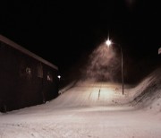 Nuit mi noire, mi blanche. À gauche, on devine des constructions. Au bout de la route, une lumière - la dernière. Film « immobile » et muet, Nightsnow met l’image à l’épreuve de la durée. La boucle, qui scelle le retour du même, l’enserre dans un temps cyclique, une léthargie qui n’est pas étrangère à la neige. 5 minutes 1 secondes, indéfiniment répétées, où le temps s’étire dans l’observation. Théâtrale, l’image nous immerge dans une atmosphère feutrée, une permanence qui appartient au monde naturel et non humain. L’échelle de la projection, invite le spectateur à s’y plonger - à l’instar d’estampes ou de paysages romantiques, qui conduisent le regard du proche vers le lointain.