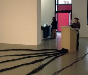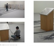 Slowmotion, From Slave to Valse is an installation with five light panels hooked up to a control console by electric cables. The artist invites visitors to use outdated computer equipment to produce letters, words, and symbols on the panels set up in the space. The visitor is then invited to write down the numbers of the buttons they used in a notebook, creating a numerical code that becomes a practical memory of the exhibited work.