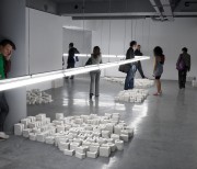 The artist dismantled phrases said by philosophers, sociologists and other figures above within his philosophical horizon, creating heaps of letters in the form of hand-made plaster casts... The white letters measured 16 cm in height and were placed in tidy piles: the ‘A’s together, the ‘B’s together, and so on. Through these, Melik Ohanian evoked a pre-linguistic stage of language. Each heap corresponded to the retranscription of the soundtrack extract of a figure’s voice, but here the letters forming this retranscription were piled up on the floor in disorder. Estrangement. Only a plaque bearing the name of the person quoted was present above the line of neon lights above the heaps, informing us of the paternity of the quotation. A few words emerged from this sea of letters, because the visitors were allowed to move the plaster letters around to re-introduce some meaning. Although the quotations were set out in Le Plateau like a series of archipelagos reduced to pure morphology, to their simple three-dimensional form, the fact remains that these were linked to another archipelago (the 15 joint exhibitions) and to the website, which in some way restored a territory to the whole in a movement of deterritorialisation/ reterritorialisation reminiscent of Deleuze. The “reading” of the heaps of letters was thus influenced — in advance or retroactively — by the meaning conveyed through the Internet.